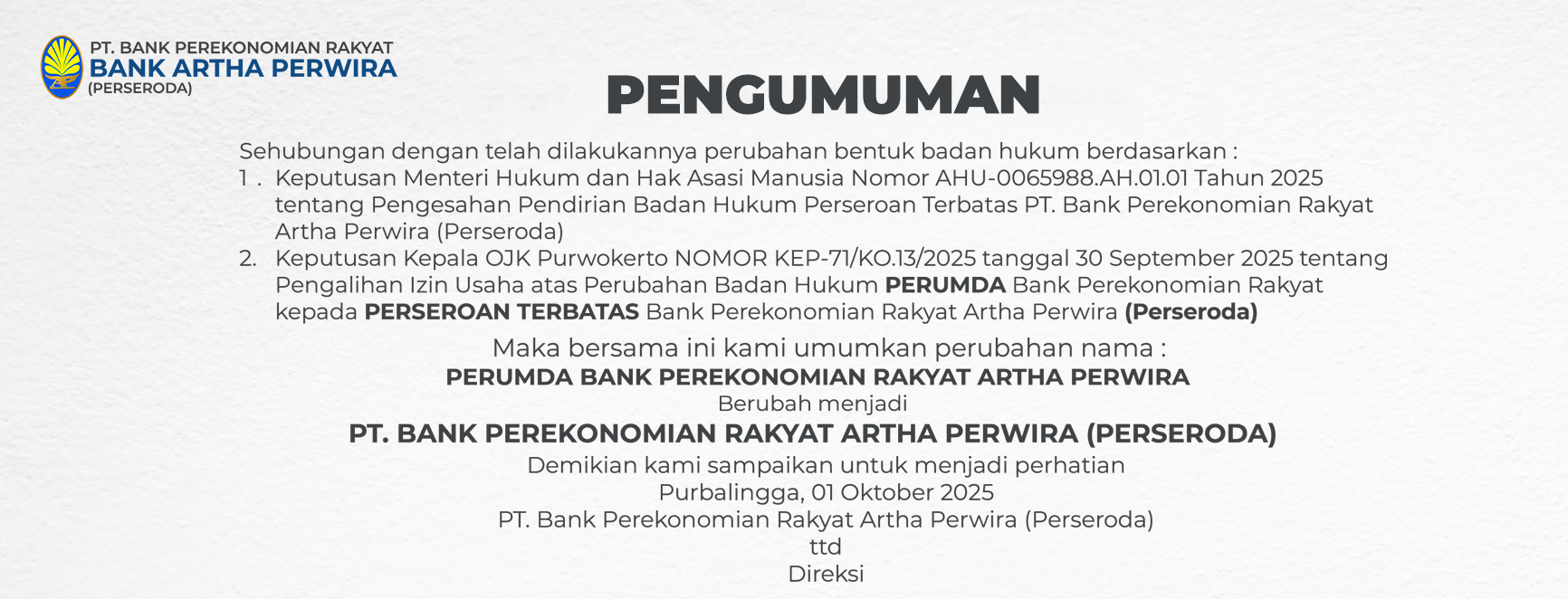 Berdasarkan Surat Keputusan Kepala Otoritas Jasa Keuangan Purwokerto Nomor NOMOR KEP-71/KO.13/2025, kami informasikan adanya perubahan nama perusahaan dari : PERUMDA BANK PERKREDITAN RAKYAT ARTHA PERWIRA Diubah menjadi PT. BANK PEREKONOMIAN RAKYAT ARTHA PERWIRA (PERSERODA)